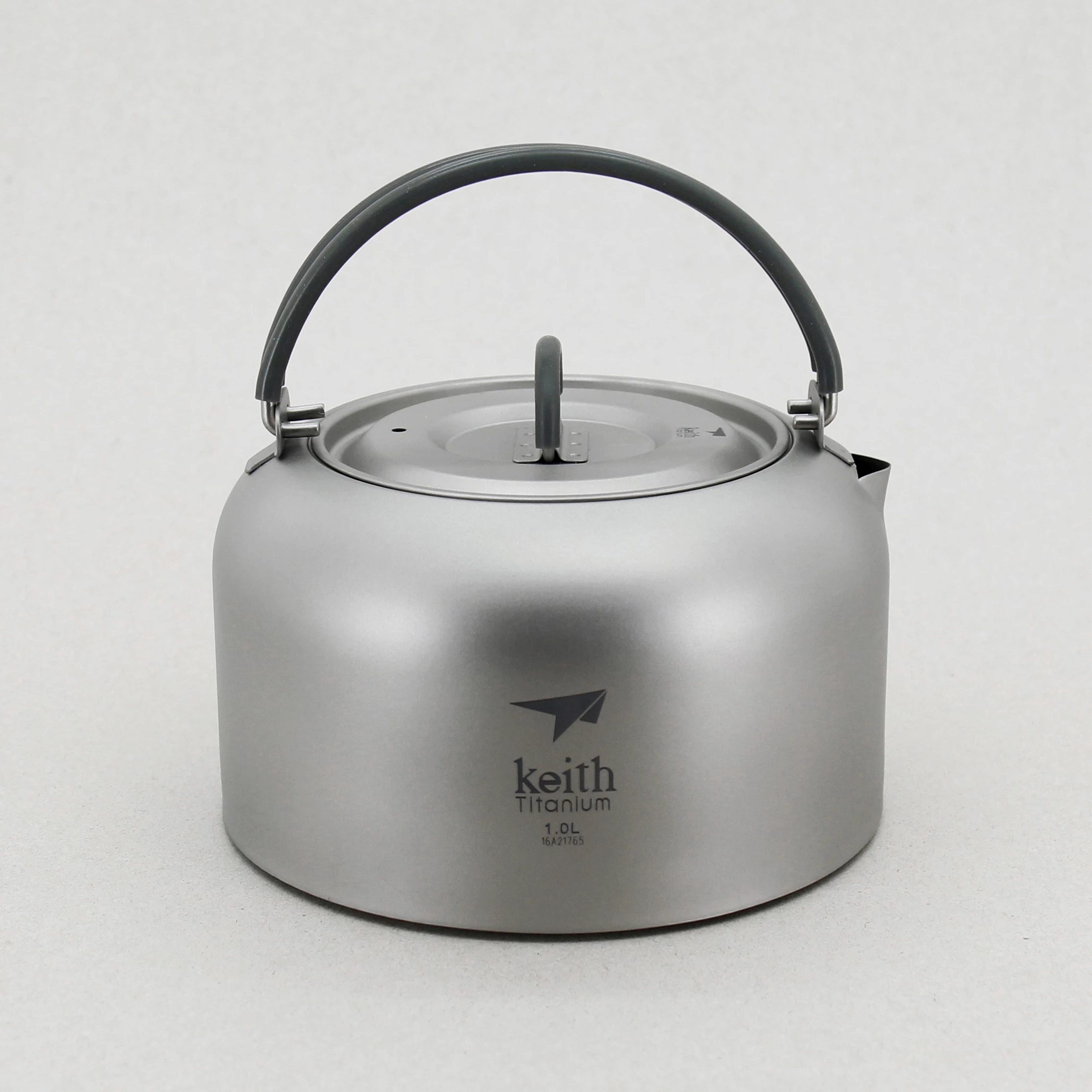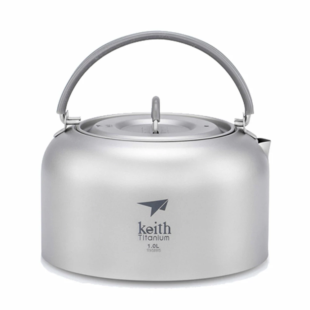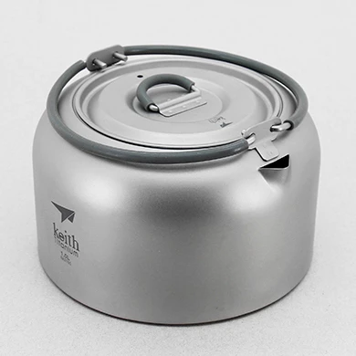The Titanium Kettle from Keith is a 1 liter camp kettle with a sanded exterior and a silicone coated handle.