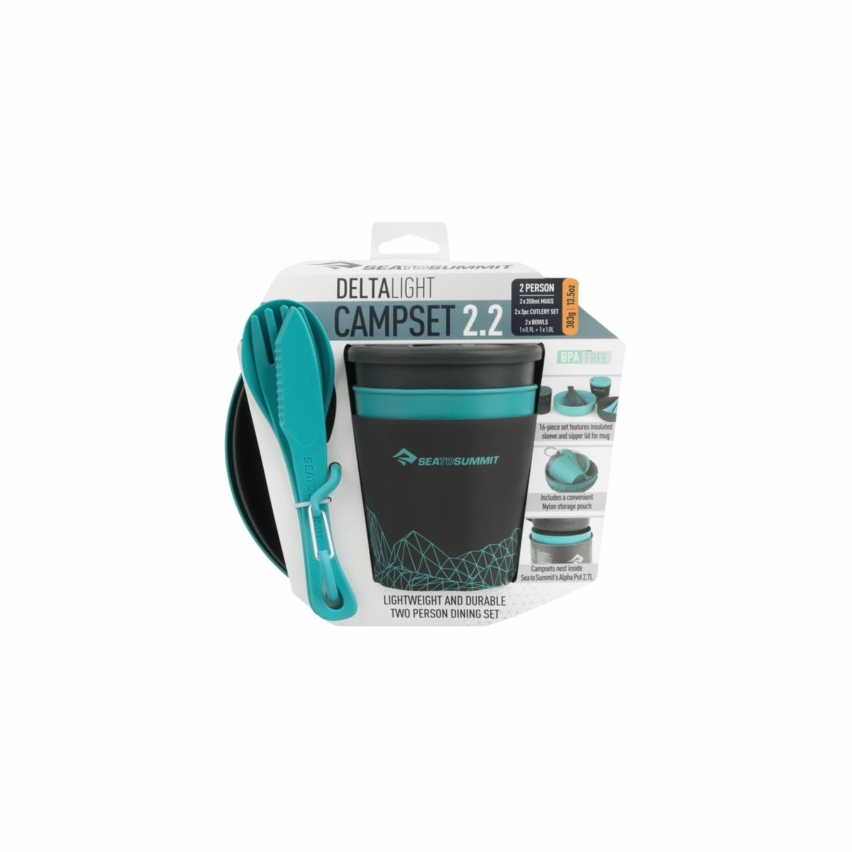 A lightweight and compact dinnerware set for two that nests inside the Sea to Summit Alpha and Sigma 2.7L pots. The entire set nests and stows inside a lightweight storage pouch. The Camp Set 2.2 includes one of each color of the Delta Light Bowls, Insul Mugs and Delta Cutlery Sets.